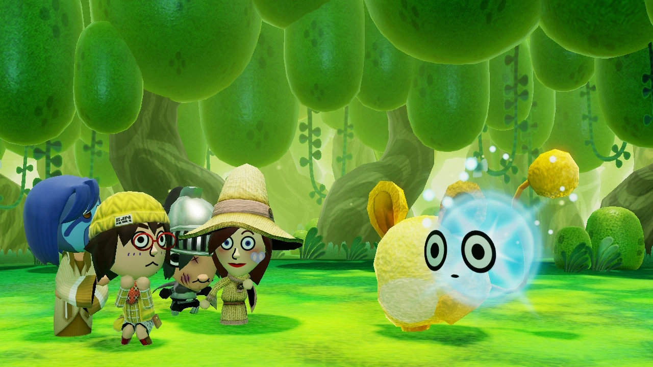 Her face will then be placed onto a big yellow mouse, who is then accompanied by two Smileshrooms. While the "Lovey-Dovey Woman" can attack one Mii along with the Miis adjacent to them, the Smileshrooms can also cause them to burst into laughing. Despite this, the party is able to defeat the mouse and its cohorts, saving the Lovey-Dovey Woman. She, along with the Lovey-Dovey Man, will celebrate the return of her face. Both of them thank the protagonist and give them three Game Tickets as a reward.