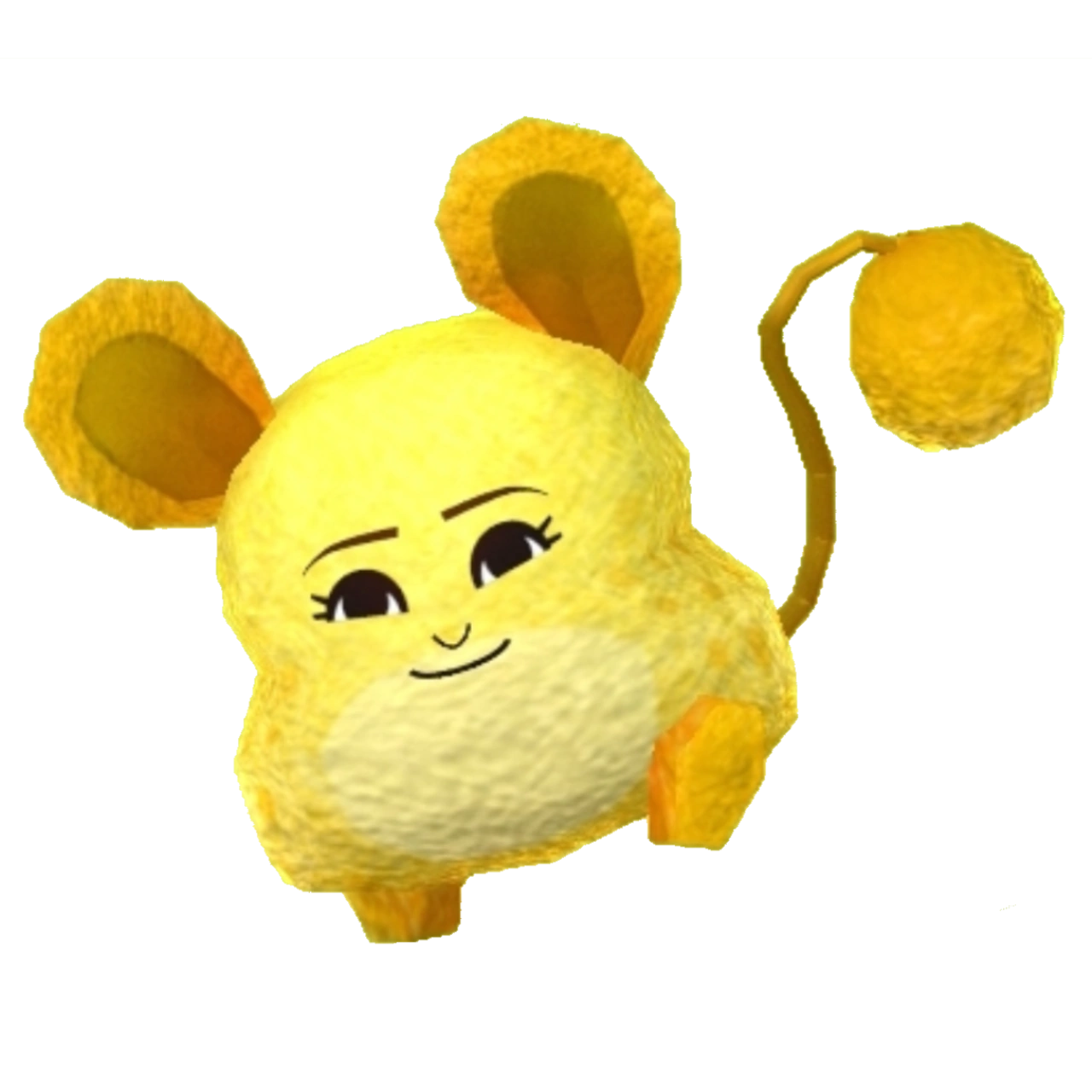 The creature is a huge armless mouse with the Lovey-Dovey Woman's (Traveler's or their friend's in post-game quests) face attached to it. Its round ears, toeless feet and ball-tipped tail are orange. Its chubby, gourd-shaped body is yellow with light yellow belly marking.