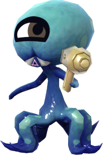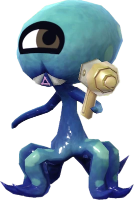 It is a five-legged light blue alien with a bulbous head bearing a single Mii eye. It holds a yellow gun in one of its thin arms.