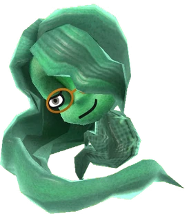 The Banshee Brainbox looks like a teal Banshee with a gray "jumpsuit" and algae-like hair. It sports a pair of Mii glasses along with eyes and a mouth.