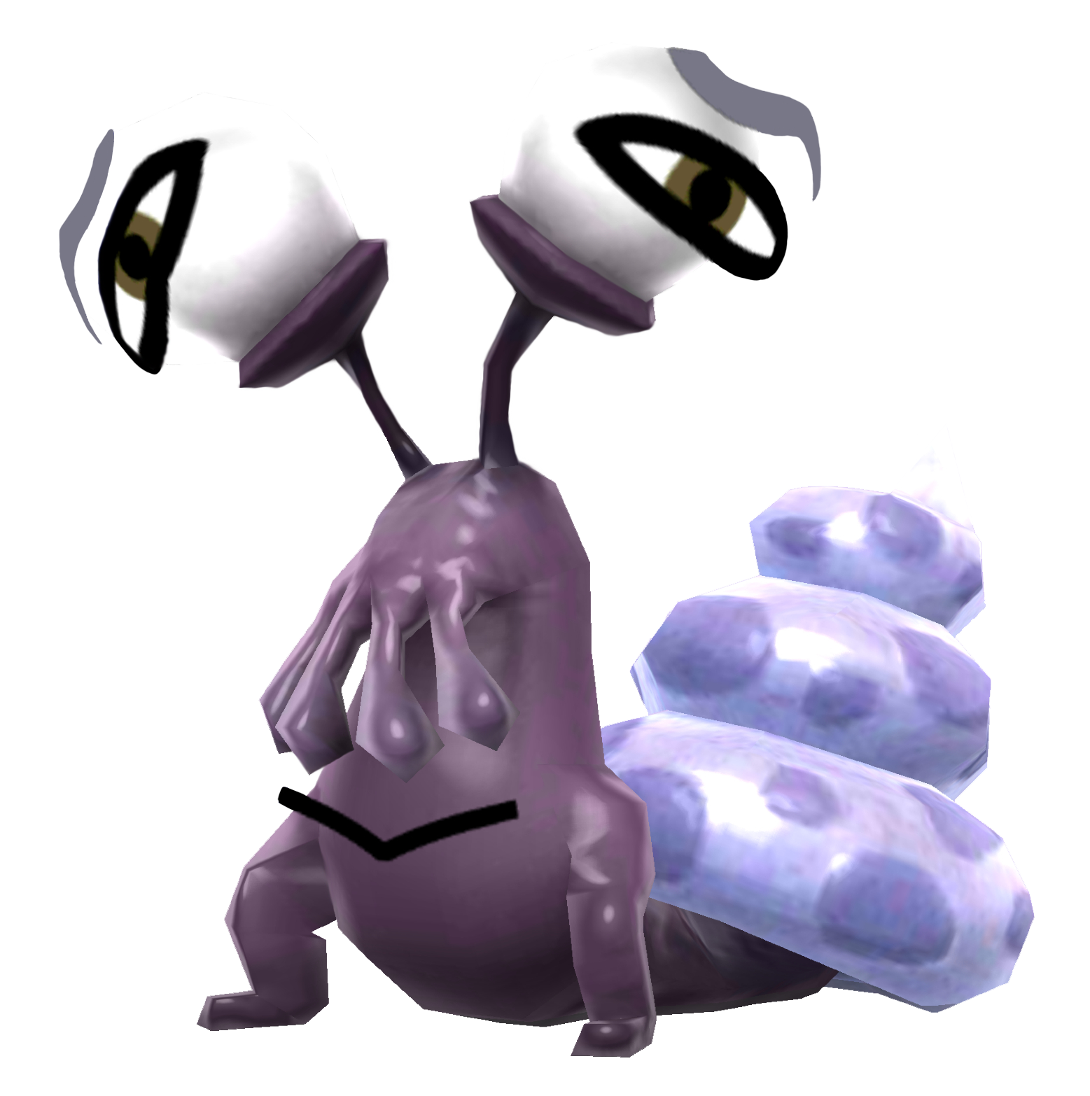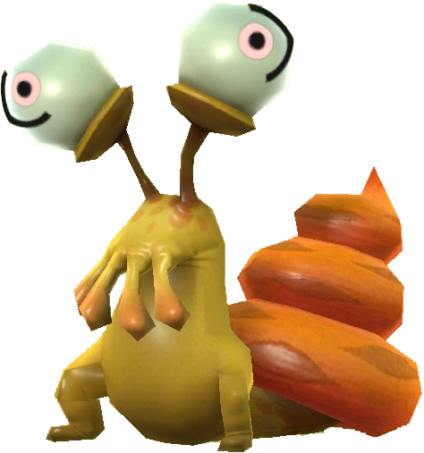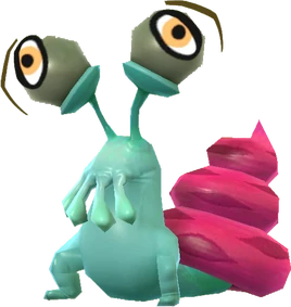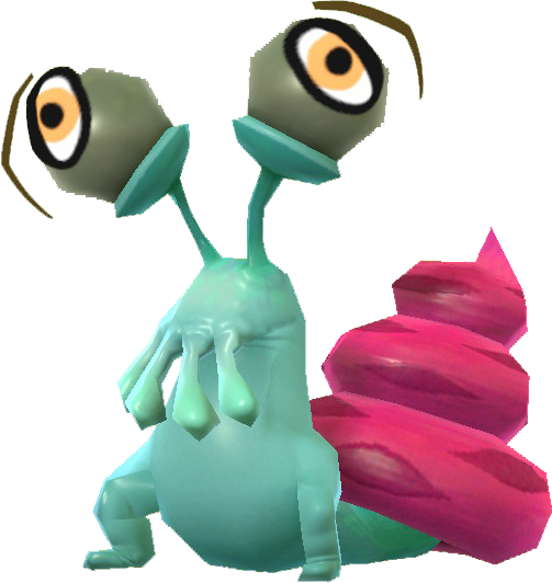 This monster is a large blue snail, hence the name, with goofy-looking blackened eyes, a tentacled mouth, and, strangely, two tiny arms. Its body is housed inside of a pink, swirled shell with burgundy spots. Two Mii eyes and eyebrows are set where the snail's pupils would be.
