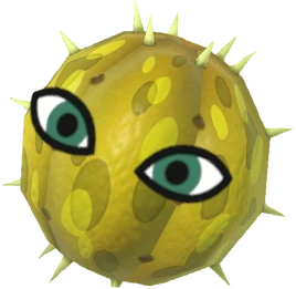 This monster is a simple, yellow, spiky cactus ball with a pair of Mii eyes attached to the front.