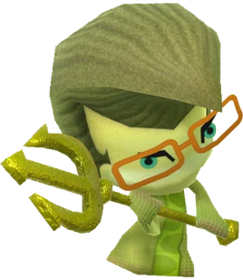 The Clever Imp is a yellow-green Imp wielding a gold pitchfork. Its front stripe is lime and its pompadour is beige. It wears a pair of Mii glasses and has Mii eyes, the former part probably sparking the name "Clever Imp."