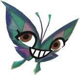 Like all butterfly-based monsters, the Death Butterfly is a crystalline butterfly. It's colored blue and has Mii eyes and a mouth attached to its front side. Like most butterfly monsters, the eyes are attached to its wings.