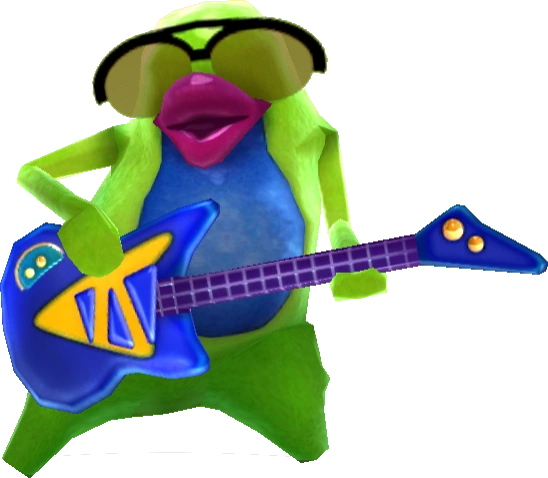 Similar to its Rock Hopper variants, the Doo-Whopper is a humanoid, penguin-like monster, but with a neon green and blue color scheme, purple lips/beak and a blue and yellow guitar. Instead of Mii eyes like other Hoppers, Mii glasses are attached to this monster.