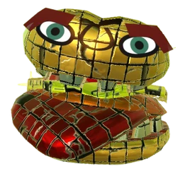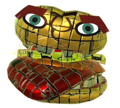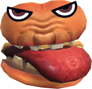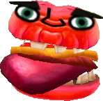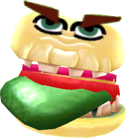 The Gourmet Burger is a block-structured burger-type monster. It contains the bread, cheese, tomato, and a patty(as a tongue). It also has teeth on the bread. Some of the tiles in the burger are broken, and some are even gone revealing only darkness. It is smaller than all other Hamburger variants. Its Mii parts consist of a pair of eyebrows, eyes, and a single nose.