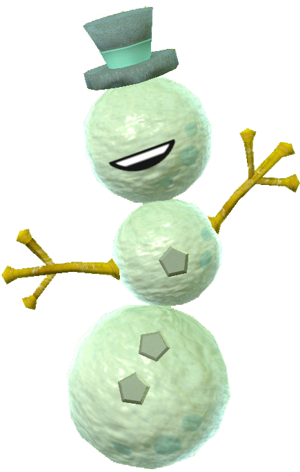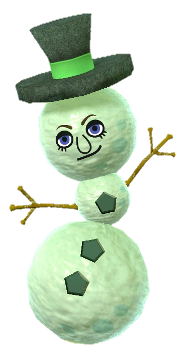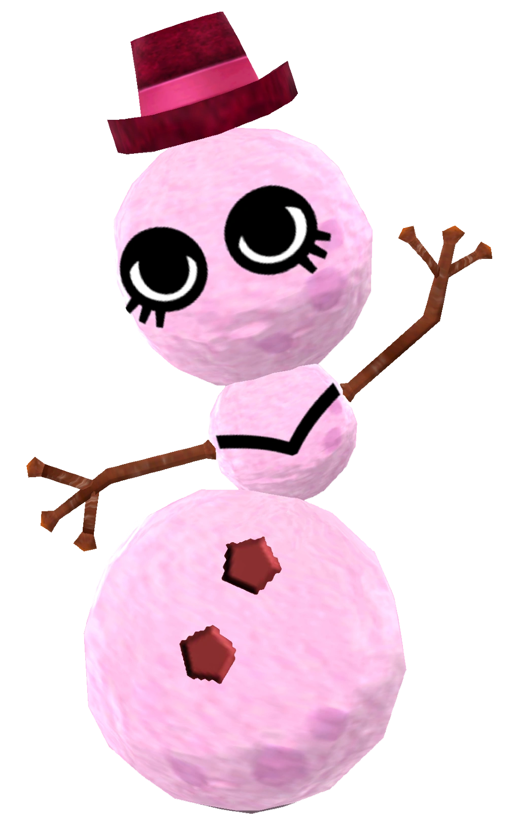 Like the Snowmen, the Ice Coolman is a sentient snowman. It has a pink and purple color scheme in contrast to the blue Snowmen. On the head part, two Mii eyes are attached to it, while its middle has a Mii mouth. Its hat resembles a fedora slightly more than a top hat.