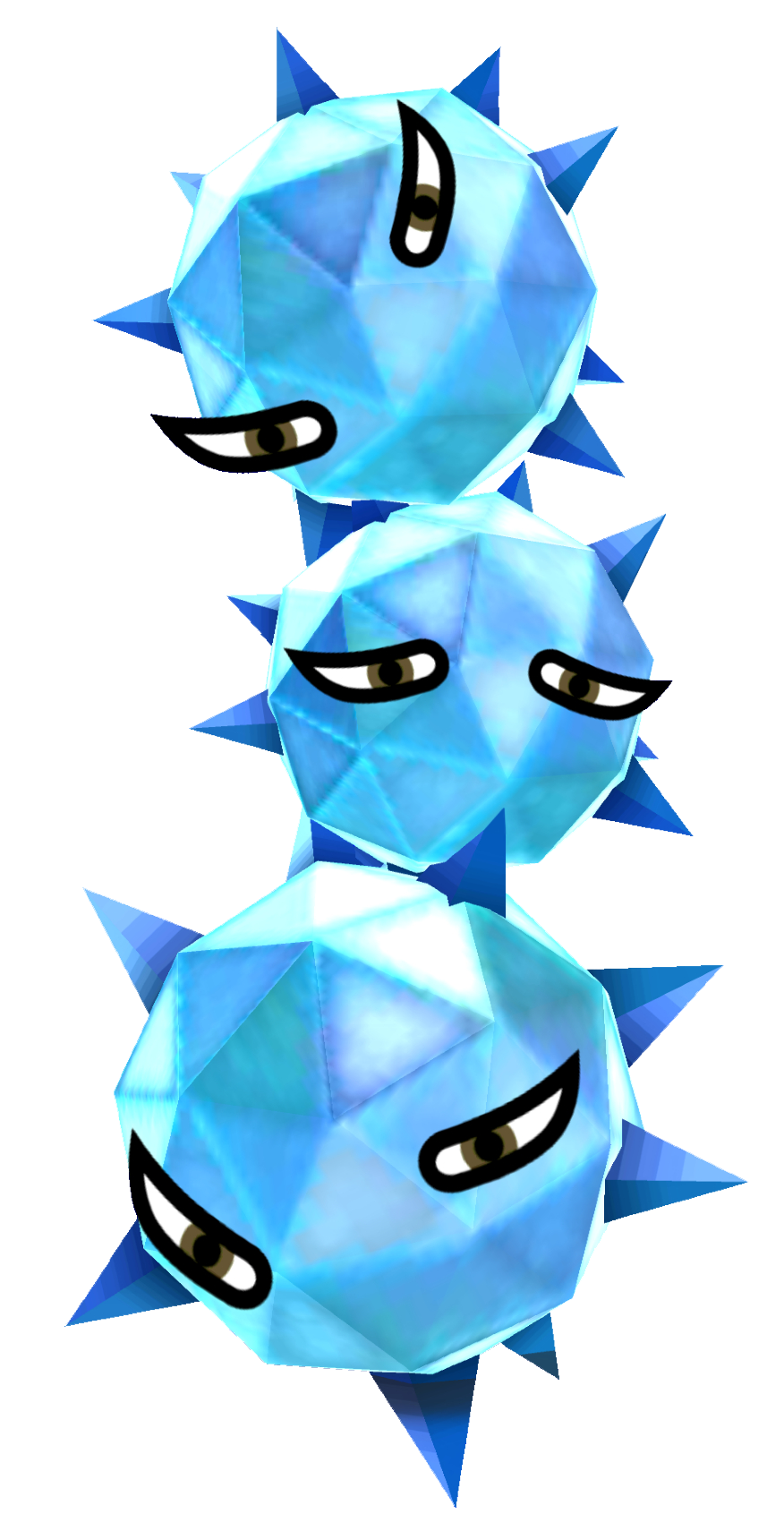 As its name suggests, this monster is similar to the Spike Tower. It's a stack of three spiked, ice balls forming a tower. They're simple and blue with white spikes. The bottom ice ball is the largest, while the middle ice ball is the smallest. Each ball has two Mii eyes in the center.