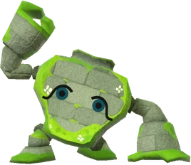 Kind Golems appear as giant, grey rock creatures with arms and legs. It holds itself to the ground with one hand while holding its other hand in the air. The Kind Golem is covered in green moss and tiny white flowers on its fists, feet, edges of its face and little bits on their legs and arms. The only Mii facial part it has are Mii eyes.