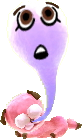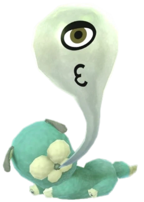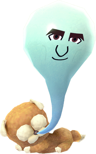 The wisp is light-gray and floats out from the puppy's nose. Its Mii parts are a single eye and mouth. The puppy itself has blue fur with silver ears, nose and paws.